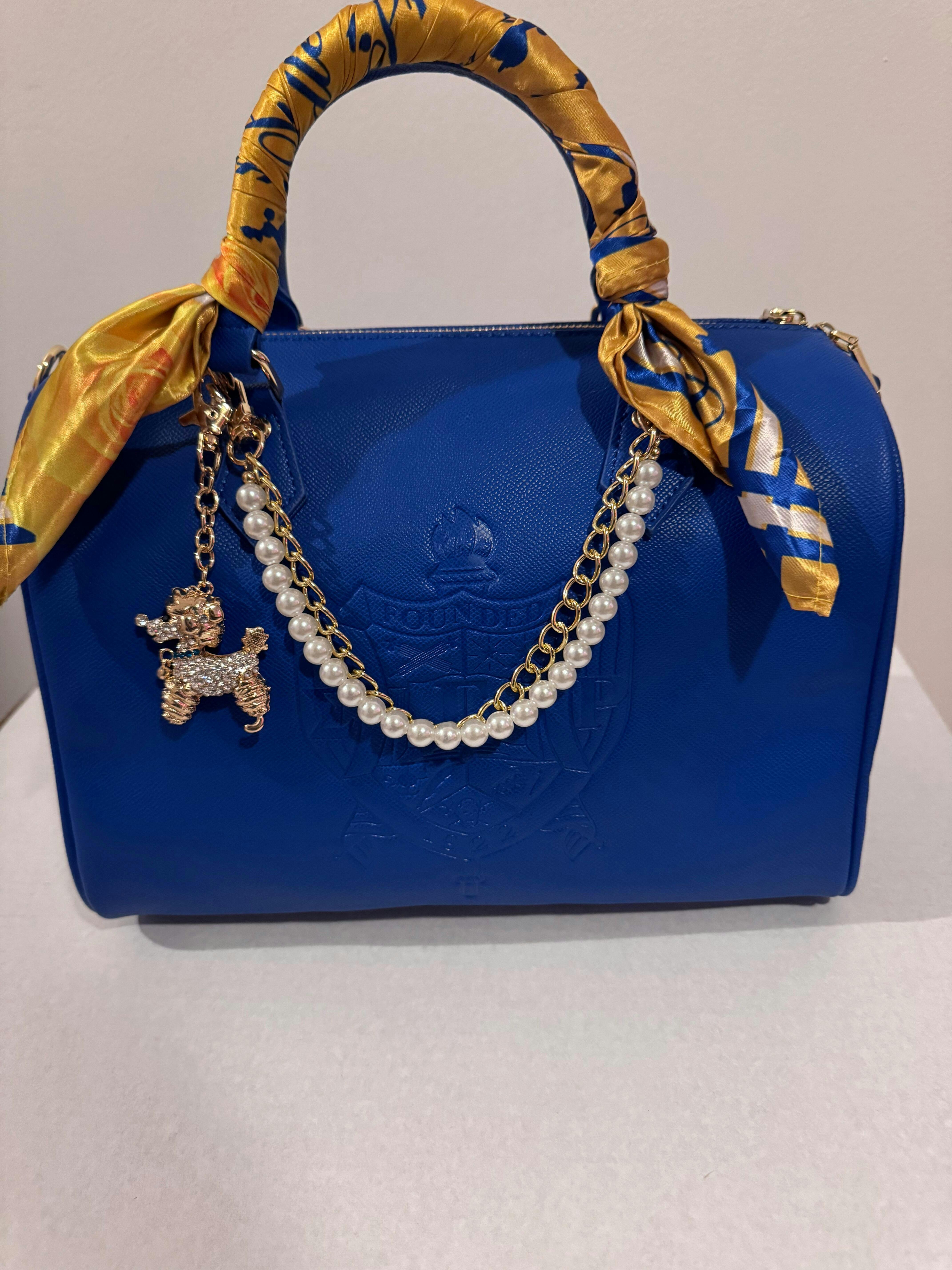 This is a beautiful bag!! I love the details! Inside the lining is blue with our Greek letters in gold. I also added some charms and a scarf. I can’t wait to use it!💙💛